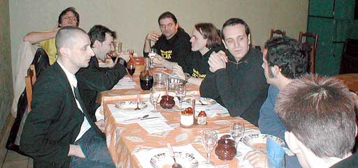 Die ganze Reisegruppe (von links nach rechts: Jean, Christophe, DJ Montechristo, MechBern, drx, Alex, DJ Kurt Russel, Greg (und der unsichtbare Dimitri)) diniert im Le Confort Moderne. |